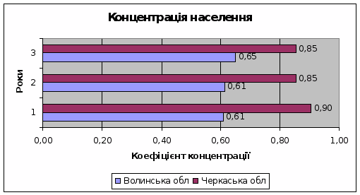 Населення у Черкаській обл. більш концентроване, а диверсифіковане – у Волинській обл., що пояснюється більшою кількістю міст та населення у Черкаській області.