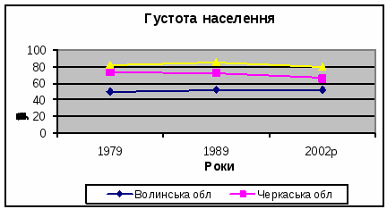 Висновок: На один км2 у Черкаській області проживає на 14 осіб більше, ніж у Волинській обл., проте даний показник Черкаської обл. на 4 особи/км2 менший від загального показника по країні, а Волинської обл. менший на 18 осіб/км2. Густота населення Черкаської обл. та України з роками зменшується, а Волинської обл. в загальному зростає, лише з 1989р до 2002р вона зменшилась на 1 особу/км2.