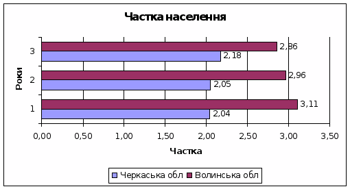 Висновок: Аналіз проведених розрахунків показав, що частка площі Черкаської обл. від загальної площі країни переважає відповідну частку площі Волинської обл. на 0,11%. І відповідно частка населення Черкащини від загальної кількості населення переважає частку Волині на 0,68% у 2002 році, у 1989р – на 0,91%, у 1979р – на 1,07%. Проте частка населення від населення країни Черкаської обл. спадає, а Волинської обл. зростає, що свідчить про відповідне зменшення та збільшення кількості населення областей.