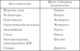На пятом этапе, в 1990-е гг., Южная Корея окончательно сформировалась как экономически развитое индустриальное государство с ощутимыми элементами постиндустриального развития. К концу этого десятилетия она заняла важные позиции в мировой экономике, о чем свидетельствует таблица 1.