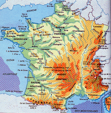 В северо-западных и северных районах страны преобладают плоские или всхолмленные равнины (Гаронская низменность, Парижский бассейн) и низкогорья, в центре и на востоке - средневысотные горы (Центральный Французский массив, Вогезы, часть гор Юра).