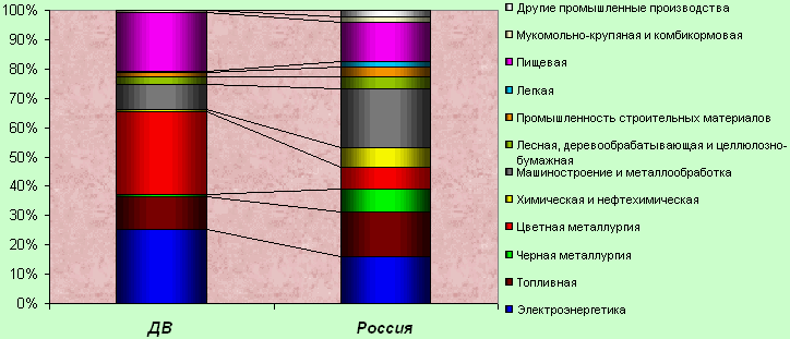 В структуре промышленного производства регионов Дальнего Востока в 2004 году ведущее положение занимают цветная металлургия (30%) и пищевая промышленность (20%), в которой явно выделяется рыбная отрасль (14,8%, на ней специализируются Камчатская область, Корякский АО и Приморский край). Среди других отраслей значительный вес имеют машиностроение и металлообработка (16,6%), топливная промышленность (12,8%) и электроэнергетика (10,9%). По существу, цветная металлургия и рыбная промышленность, развитые на базе богатых сырьевых ресурсов, определяют место Дальнего Востока на внутрироссийском рынке. В меньшей степени это относится к машиностроению и топливной промышленности.
