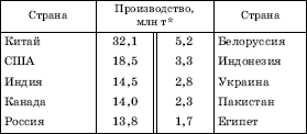Мировое производство минеральных удобрений в 50—70-х гг. XX в. росло очень быстро, в 80-х гг. замедлилось, а в 90-х гг. (в том числе и из-за резкого снижения его уровня в странах СНГ) фактически стабилизировалось на уровне 145–150 млн т (в пересчете на полезное вещество). Одновременно наметились существенные изменения в размещении этой отрасли, связанные прежде всего с увеличением числа стран-производителей в Азии, Африке и Латинской Америке и их доли в мировой продукции. Еще в 1950-х гг. 40 % минеральных удобрений производилось в Западной Европе (Германия, Франция, Великобритания, Италия, Бельгия, Нидерланды), около 30 % – в Северной Америке (США, Канада) и около 20 % – в СССР, а к концу 1990-х гг. на первое место вышла зарубежная Азия (около 40 %), на втором осталась Северная Америка (25), на третьем оказались страны СНГ (15) и только на четвертом – Западная Европа (12 %). Соответственно изменился и состав первой десятки стран: в ней заметно уменьшилось число стран Западной Европы, но увеличилось число азиатских стран (табл. 1).