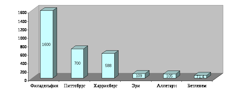 Филадельфия (в переводе с греческого “братская любовь”) расположена в 120 км к югу от Нью-Йорка, у впадения в р. Делавэр ее притока р. Скулкилл. До города могут подниматься большие океанские суда; при слиянии обеих рек и вдоль берегов р.Делавэр имеется достаточно места для обширных доков и причалов. В середине XVIII в. Филадельфия была самым большим городом 13 колоний; как транспортный и торговый центр она успешно конкурировала с Нью-Йорком вплоть до открытия Эри-канала. Ныне Филадельфия, хотя она и намного уступает Нью-Йорку, – второй по числу жителей и экономическому значению город на Атлантическом побережье и один из самых крупных городов США. В 1990 г. в нем было 1,6 млн. жителей, а с пригородами – 5,9 млн. (есть метрополитен). Филадельфийский порт (грузооборот ок. 50 млн. т в год), протянувшийся на много десятков километров по обоим берегам нижнего течения р. Делавэр, но весу перерабатываемых грузов занимает второе место в стране, уступая лишь Нью-Йоркскому. Среди прибывающих в него массовых грузов наиболее важные – нефть и железная руда. В отличие от Нью-Йорка Филадельфия – преимущественно промышленный центр. Торговля и финансы играют в ней меньшую роль, чем в Нью-Йорке: процент занятых в промышленности значительно выше. Долгое время Филадельфия была третьим но значению промышленным центром страны, но сейчас она оттеснена на пятое место Лос-Анджелесом и Детройтом. Промышленность Филадельфии, как и большей части других больших городов Атлантического побережья, очень разнообразна; однако в отличие от Нью-Йорка главную роль здесь издавна играет тяжелая индустрия, в особенности машиностроение. По переработке нефти этот юрод занимает второе место в США и первое на Севере. Сильно развита в Филадельфии легкая (текстильная и швейная) и полиграфическая промышленность. Различные заводы и фабрики тянутся почти непрерывной лентой вдоль берегов Делавэра (более чем на 100 км) – от Трентона до Уилмингтона.