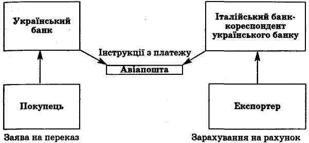 Наприклад, український покупець доручає своєму банку перевести італійському продавцеві 100 000 євро на його рахунок №9872-A/126790 в оплату інвойса №176–56 і дебетувати свій рахунок №0703457698012. Український банк по отриманні інструкцій від покупця перевіряє правильність заповнення заяви на переказ, відповідність реквізитів бенефіціара (покупця), його банку, їх адреси, дізнається, чи достатній залишок на рахунку покупця, щоб сплатити поштово-телеграфні витрати українського банку і комісію за виконання переказу. Потім український банк дебетує у себе рахунок вітчизняного покупця відповідно до його вказівок і надсилає інструкції своєму банку-кореспонденту в Італії, зазначаючи всі деталі платежу (Рис. 1).