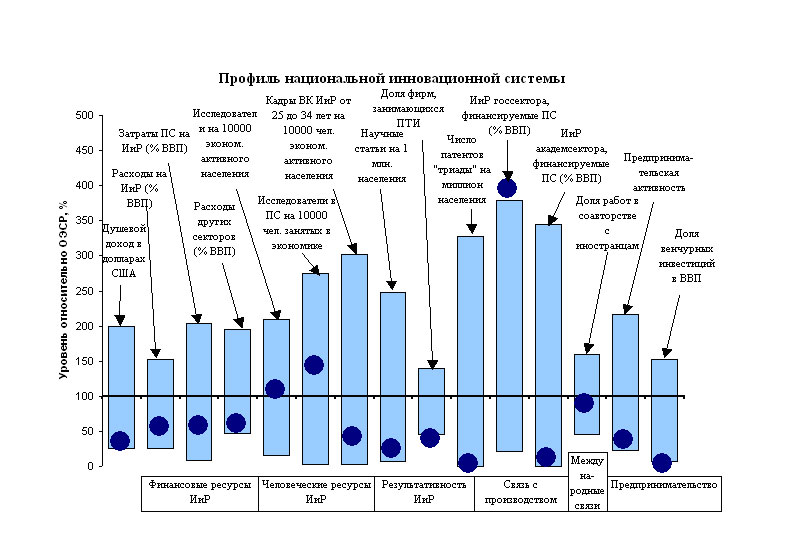 Инвестиции в сектор знаний в среднем для всех стран ОЭСР составляли к началу 21 века около 4,7% ВВП, по сравнению с 1,6% ВВП в России. По вкладу наукоемких отраслей в ВВП российская экономика более чем вдвое отстает от среднего уровня ОЭСР, а по их доле в экспорте – в 20 раз по сравнению со среднеевропейским уровнем.