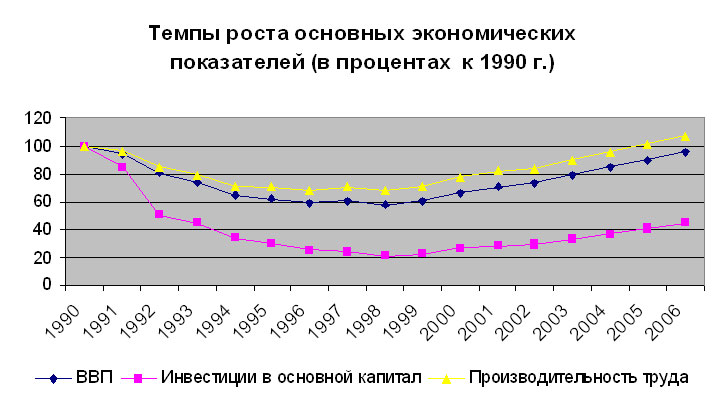 Резко (с 45%-го превышения до 25%-го отставания от среднемирового уровня) за годы реформ снизилась производительность труда. Если бы не еще сохраняющийся, относительно высокий уровень образования населения и квалификации трудовых ресурсов, имеющийся научно-технический потенциал, ракетно-ядерный оборонный щит, то погружение на периферию мировой экономики и утрату возможностей собственного экономического развития можно было бы считать необратимыми. Продолжение сложившихся тенденций деградации научно-производственного потенциала страны еще несколько лет будет означать закрепление периферийного положения российской экономики.