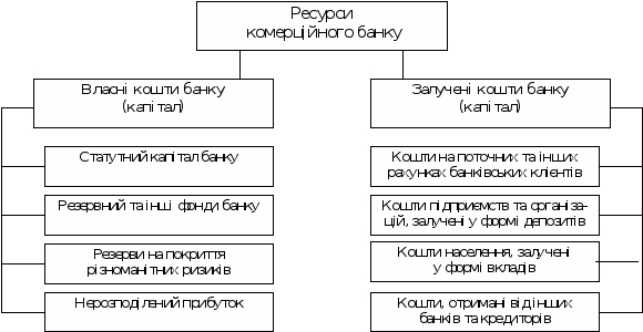 Банківські ресурси з точки зору джерел утворення поділяються на власні і залучені. До власних коштів банку належать статутний капітал, резервний та інші фонди, резерви на покриття різноманітних ризиків і нерозподілений прибуток. До залучених коштів відносяться кошти на депозитних рахунках банківських клієнтів, позики, отримані від інших банків, і кошти, отримані від інших кредиторів.