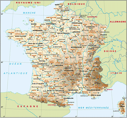Nord du Mont Blanc. Divisions administratives de la France La France est divisée en 96 unités administratives - les ministères. Le statut particulier des départements d'outre-mer sont la Guadeloupe, Martinique, Polynésie française, territoire de l'Antarctique Sud, la Guyane, Réunion, Saint-Pierre, à Mayotte, Miquelon, Wallis et Futuna. En France, 22 provinces historiques (Bourgogne, Bretagne, Lorraine, Navarre, Provence, etc.) France Climate La France est dans la ceinture de climat chaud tempéré. À Paris, la température du mois le plus chaud (Juillet) est de 14-24C, le plus froid (Janvier) 1-6C. Sur la côte de l'Atlantique, il ya une forte influence océanique, alors que le sud de la puissance du climat méditerranéen. Dans la vallée des cent jours Rhône un an, mistral souffle froid qui amène sur la côte sud de froid inhabituel.