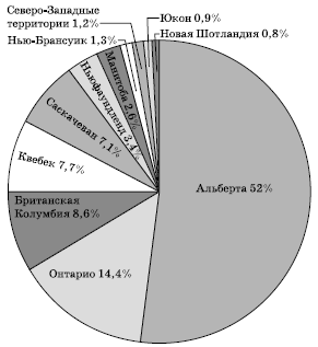 Кроме того, в провинции Альберта, в 400 км к северо-востоку от Эдмонтона, находятся крупнейшие в мире залежи битуминозных песчаников, расположенные в бассейнах рек Атабаска, Пис-Ривер и др. Эти пески, содержащие примерно 14 % нефтяных продуктов, занимают территорию 80 тыс. км2. Потенциальные запасы жидких углеводородов в них оцениваются огромной цифрой в 75 млрд т; она означает, что здесь сконцентрирована значительная часть всех возможных ресурсов углеводородов на планете. Разработка битуминозных песчаников Альберты и получение из них нефти начались в 1960-х гг. Интерес к ним особенно возрос после энергетического кризиса середины 1970-х гг. Но и после того как мировые цены на нефть снова снизились и этот интерес заметно уменьшился, здесь продолжают работать предприятия по получению нефти из песков, производящие ежедневно 60 тыс. т жидкого топлива. В 2000 г. в связи с ростом цен на нефть ресурсы нефти Канады были пересмотрены в сторону значительного увеличения – с 1 до 24 млрд т! В результате по этому показателю страна заняла 2-е место в мире после Саудовской Аравии. В целом же на долю провинции Альберта приходится более половины всей продукции горнодобывающей промышленности Канады (рис. 2).