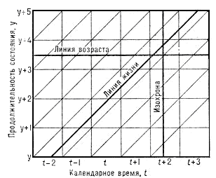 Сетка демографическая изображает в прямоугольной системе координат убывание во времени численностей когорт вследствие демографических событий. По горизонтальной оси отсчитывается календарное время, по вертикальной - продолжительность пребывания в том или ином демографическом состоянии (или собственное время когорты - возраст, продолжительность брака и т.д.). Оси координат обычно делятся на равные отрезки, соответствующие одним и тем же единицам времени и продолжительности состояния, а перпендикуляры к осям, восстановленные из граничных точек этих отрезков, образуют сетку из квадратов со стороной, соответствующей единице времени (см. рис.1). Степень дробности шкал зависит от скорости изменения когорты под влиянием изучаемого явления. Например, при изучении младенческой смертности шкалы разбиваются по месяцам, иногда неделям и дням, для других демографических процессов - как правило, по годам, реже, по пятилетиям.