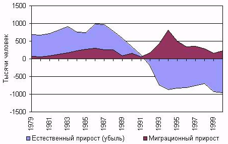 С 1992 г. началась естественная убыль населения и миграция стала единственным источником восполнения потерь в численности населения России. Даже в пиковом 1994 г., когда миграционный прирост составил 811тыс. человек, он не компенсировал естественную убыль россиян.