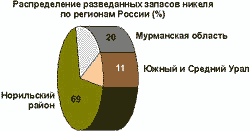 Самым крупным месторождением никеля, является Норильское, в нем сосредоточенно 35,8 % мировых запасов. Так же добываются сульфидные медно-никелевые руды на Кольском полуострове и окисленные силикатные никелевые на Урале (Буруктальское и Черемшанское месторождения.). важнейшее свойство никеля состоит в том, что его незначительная добавка придает сплавам прочность, твердость и коррозионную стойкость. Отрасль ориентирована в размещении на источники сырья.