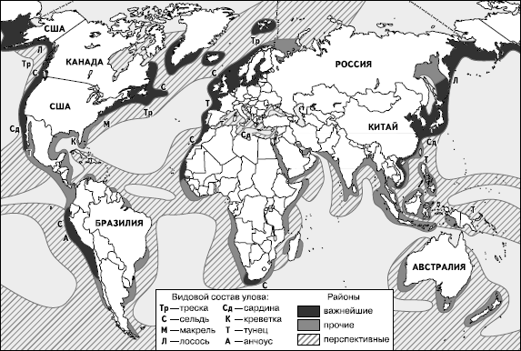 В-четвертых, изменяется соотношение между главными районами рыболовства в этих океанах, показанными на рисунке 101. Как и на суше, в Мировом океане есть биологически высокопродуктивные акватории и низкопродуктивные акватории. Первые из них находятся там, где наиболее активно протекают процессы фотосинтеза и образуются скопления биомассы – пищи для нектона. При этом, конечно, имеют значение и такие факторы, как географическое положение, глубины, характер вертикальных и горизонтальных перемещений водных масс, состав ихтиофауны, характер ее питания.
