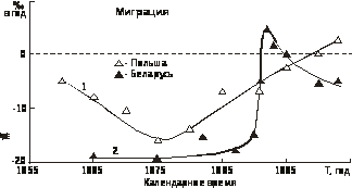 На рис. 3 показана динамика коэффициента миграционного прироста в Польше (кривая 1) и Беларуси (кривая 2).