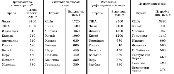 Так, для алюминиевых руд характерно достаточно высокое содержание полезного компонента (40–60 %), а в рудах тяжелых цветных металлов оно низкое и очень низкое: в рудах цинка – от 2–3 до 15–20 %, свинца – от 1 до 3, меди – от 0,5 до 3, олова и вольфрама – менее 1 %, а в рудах молибдена и кобальта измеряется сотыми долями процента. Поэтому в размещении алюминиевых заводов обычно преобладает транспортная и энергетическая ориентация, а размещение предприятий по выплавке тяжелых цветных металлов почти всегда имеет сырьевую ориентацию. Эту закономерность можно проследить на примере США, Канады, Австралии, России, Казахстана, Испании, Польши и других развитых стран, где главные районы и центры выплавки тяжелых цветных металлов сформировались в местах добычи руд меди, свинца и цинка. То же можно наблюдать и в развивающихся странах.