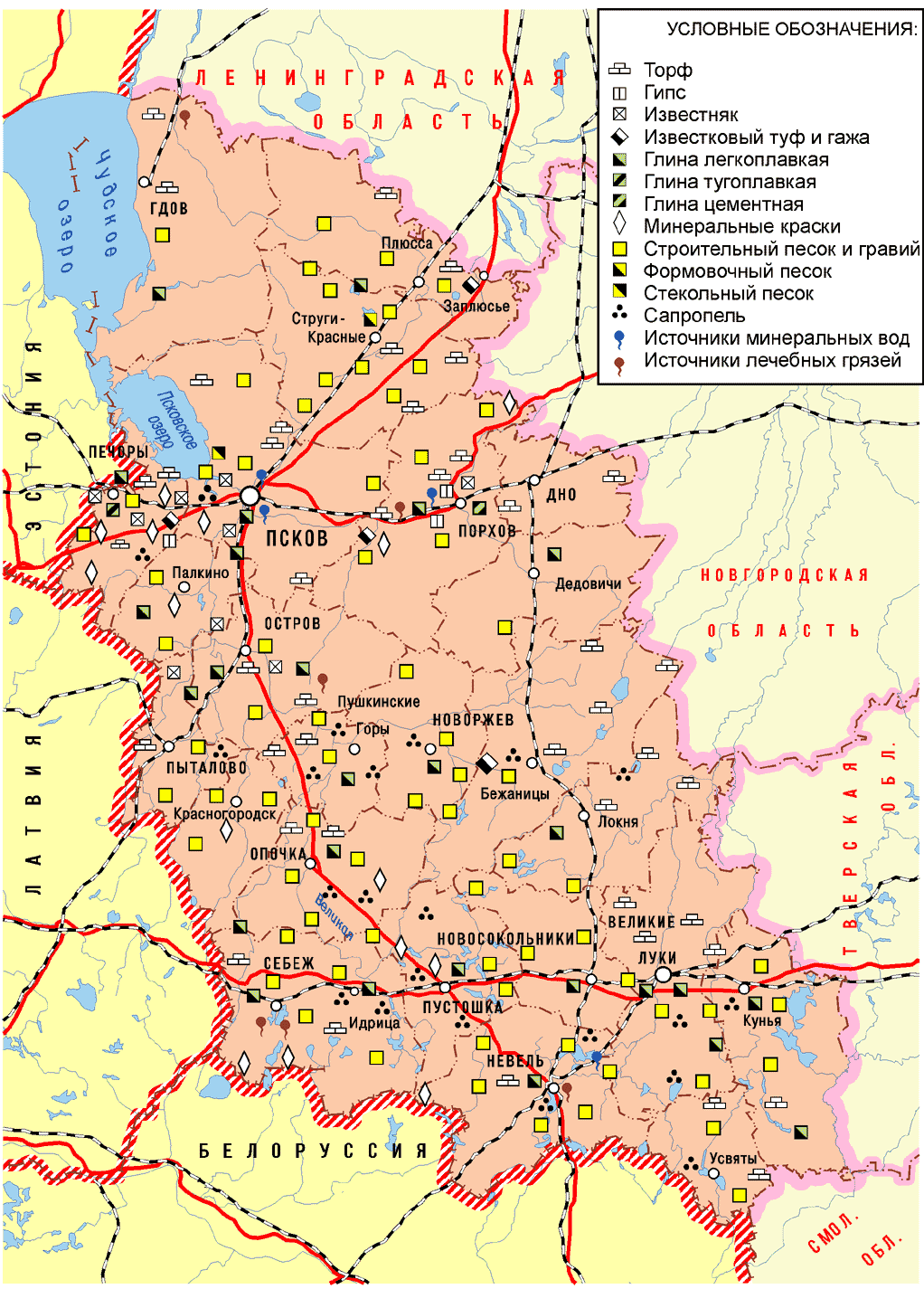 Из природных ресурсов Псковской области наибольшую ценность представляют запасы известняков, песчано-гравийного материала, доломитов, мергелей, гипса, тугоплавкие и легкоплавкие глины, формовочные пески, сырье для производства минеральных красителей, сапропель и лечебные грязи, подземные минеральные воды1.