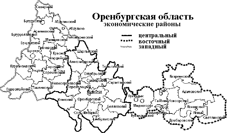 По плотности населения (22 жителя на 1 кв.км) и численности трудовых ресурсов (74,0 процента от трудовых ресурсов области) выделяется центральный район, включающий в себя 12 районов и 2 города (гг.Оренбург, Соль-Илецк). Здесь сосредоточен газовый комплекс области (доля промышленности газового комплекса от объема промышленности в целом по области составляет около 30,0 процента), самый высокий по доле стоимости недр области – Оренбургский район, в котором наиболее развитые траспортно-дорожные и инженерные сети, торговая сфера, объекты здравоохранения, образования, культуры.