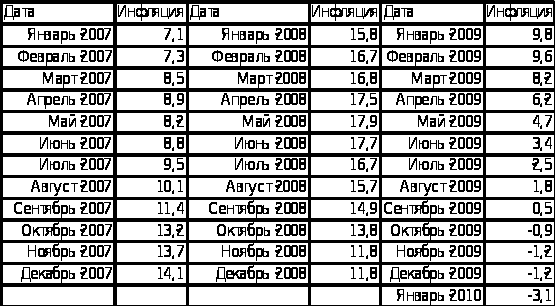 Инфляция с августа 2007 года перешла на двузначные цифры процентов по сведениям Статистического управления Латвии. Индекс потребительских цен (индекс инфляции) в годовом исчислении: