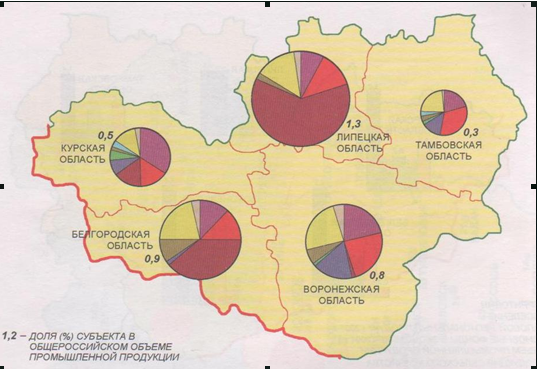 Территориальная организация хозяйства Центрально-Черноземного района характеризуется большими диспропорциями. Высок удельный вес в промышленном производстве областных центров. Воронеж, Липецк и Курск дают более 60% промышленной продукции своих областей, Белгород и Тамбов соответственно 30 и 35%. Низок потенциал средних и малых городов. Имеются и значительные различия между областями, что выражается прежде всего в гипертрофированной роли Воронежской области в промышленном производстве региона. Правда, в последнее время за счет интенсивного развития ТПК КМА в Белгородской и Курской области, металлоемкого машиностроения в Липецкой области, машиностроения и химической промышленности в Тамбовской области эти диспропорции сглаживаются.