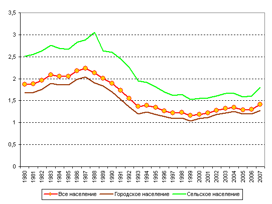 Показатель, не зависящий от половозрастной структуры населения, - коэффициент суммарной рождаемости (итоговое число рождений в расчете на одну женщину условного поколения) – также свидетельствует о том, что в России в 1999-2004 годах происходило увеличение интенсивности деторождения, как в городской, так и в сельской местности, хотя у горожан рост был заметно большим (рис. 1). В 2005 году снижение отмечалось и на селе, и в городах, а в 2006 году рост рождаемости обозначился только у сельского населения. В 2007 году впервые прирост показателя в сельской местности (0,19 детей на одну женщину) двукратно превысил прирост рождаемости у горожан (0,08). В результате, если в начале 1990-х годов итоговая рождаемость у сельских жителей была выше, чем у городских, примерно на 0,9 ребенка в расчете на одну женщину, то к 2005 году разрыв между сельской и городской местностью сократился до 0,39, т.е. более чем в два раза. В 2006-2007 годах различия между городской и сельской местностью вновь возросли, достигнув 0,52 ребенка [4, С.221].