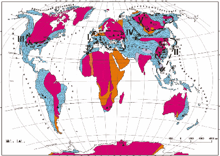 VI. Тарима – Внутренней Монголии. VII. Енисейско-Оленекская. VIII. Северо-Запада Тихоокеанского кольца. IX. Кордильер.