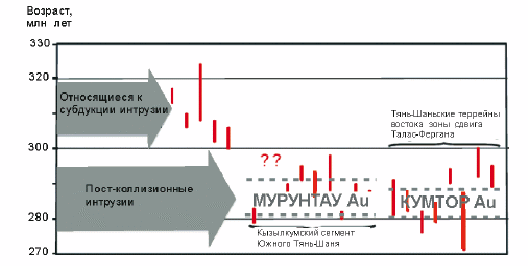 A. Yakubchuk et al. [17] полагают, что герцинский Тянь-Шаньский ороген формировался в ходе позднепалеозойской коллизии континентов Каракум-Таримского и Палео-Казахстанского. Западная часть Тянь-Шаня в Казахстане и Узбекистане образована: 1 – северотянь-шаньской деформированной окраиной Палео-Казахстанского континента; 2 – среднетянь-шаньской позднепалеозойской вулкано-плутонической дугой; 3 – южнотянь-шаньским интенсивно деформированным складчатым и надвиговым поясом на месте окончательного закрытия Палео-Туркестанского океана. На рис. 2 пунктирными линиями выделен временной интервал становления (в пределах погрешности) двух главных месторождений золота: Мурунтау Кызылкумского сегмента и Кумтор на востоке зоны сдвига Талас-Фергана.