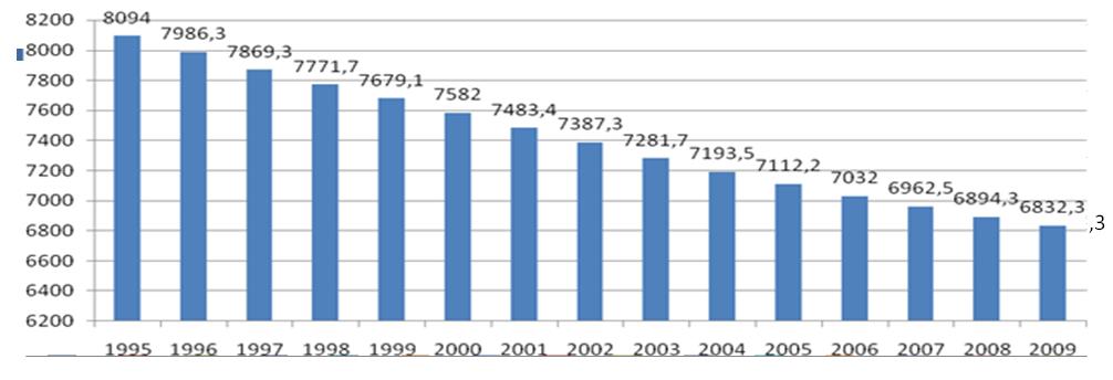 На протяжении 1995 – 2008 гг. численность населения региона имеет стабильную тенденцию к уменьшению (рис. 1).