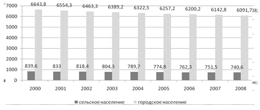 Из рис. 3 видно, что на протяжении 2000 – 2008 гг. численность сельского населения уменьшилась на 99 тыс. чел. или на 11,8%; численность городского населения уменьшилась на 552,1 тыс. чел. или на 8,3%, тем не менее, соотношение между ними в целом по региону на протяжении анализируемого периода оставалось практически неизменным.