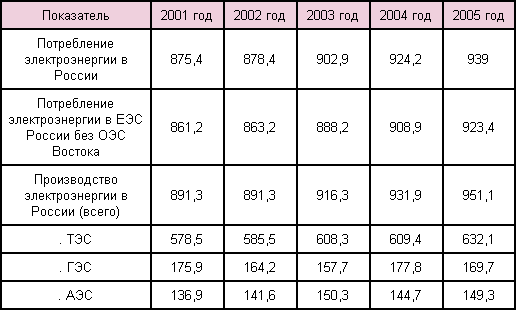 Все эти факторы, безусловно повлияли на развитие электроэнергетики России в 90-е годы. Потребление электроэнергии в России после спада 1990-1998 гг. в 2000-2005 гг. неуклонно росло и в 2005 г. достигло уровня 1993 г. При этом пиковая нагрузка в единой энергетической системе России зимой 2006 года превысила показатели 1993 г. и составила 153,1 ГВт. (II,10). Так, данные таблицы показывают количество произведённой и потреблённой энергии с 2001 по2005 г.