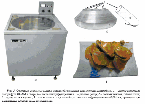 В связи с изложенным для выделения и подготовки к лабораторным анализам гли нистой фракции в больших масштабах наиболее целесообразно использовать центрифугирование с большим запасом полиэтиленовых колб. Применение центробежной центрифуги позволяет в десятки раз ускорить лабораторный процесс при минимальных воздействиях на глинистые минералы.