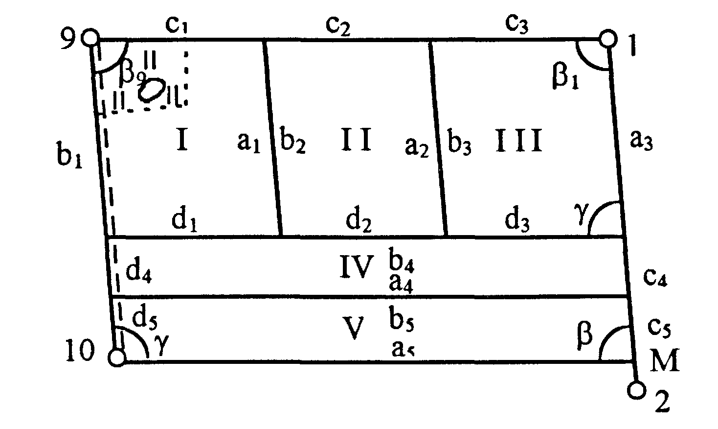 Разделить массив пашни в северной части землепользования на участки в соответствии с рисунком 6, при этом границы между ними провести карандашом (линии NK и 23 - L параллельны линии 13 - 12), обозначить номера контуров. Вкрапленные контуры обозначить тем же номером, что и основной контур с добавлением индекса “а”, “б” и т.д.