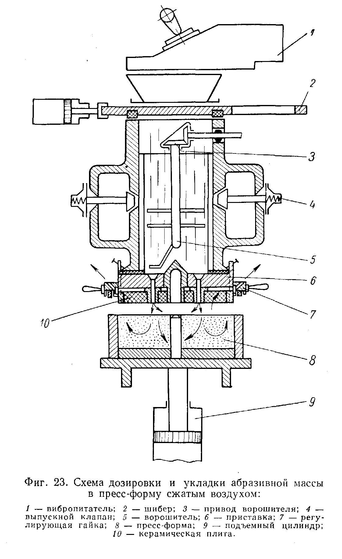 Абразивные изделия заданной геометрической формы и объемного веса изготовляются формованием. В большинстве случаев это достигается за счет прессования абразивных изделий в специальных пресс-формах на прессах различной конструкции. Процесс формования состоит из ряда технологических операций, выполняемых последовательно или параллельно при помощи специальных механизмов и устройств. Главнейшие из этих операций следующие: дозировка абразивной массы, укладка ее в пресс-форму, прессование, выталкивание изделия и укладка его на сушильную плиту, очистка и смазка пресс-формы, а также транспортные операции. Все эти операции выполняются специальными механизмами.