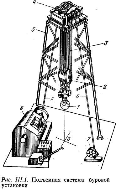 Подъемная система установки (рис. III.1) представляет собой полиспастный механизм, состоящий из кронблока 4, талевого (подвижного) блока 2, стального каната 3, являющегося гибкой связью между буровой лебедкой 6 и механизмом 7 крепления неподвижного конца каната. Кронблок 4 устанавливается на верхней площадке буровой вышки 5. Подвижный конец А каната 3 крепится к барабану лебедки 6, а неподвижный конец Б — через приспособление 7 к основанию вышки. К талевому блоку присоединяется крюк 1, на котором подвешивается на штропах элеватор для труб или вертлюг. В настоящее время талевый блок и подъемный крюк во многих случаях объединяют в один механизм — крюкоблок.