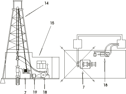 Бурение скважины начинается с подготовки подъездных путей и площадки для буровой установки. Перед началом бурения на месте заложения запроектированной скважины разравнивается площадка, выкапываются ямы под емкости для промывочной жидкости и под фундаменты и собирается буровая вышка 14 с буровым зданием 15. В вышке монтируются в требуемом направлении буровой станок 7, буровой насос 18, электродвигатели 19 для привода станка и насоса (рис.3.1). При отсутствии электроэнергии станок и насос приводятся в действие через соответствующую трансмиссию от двигателя внутреннего сгорания (ДВС)