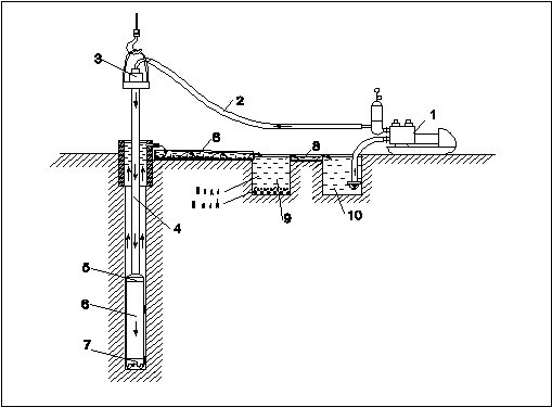 Одновременно оборудуется система для очистки бурового раствора от частиц разбуренной породы. Для охлаждения коронки, очистки забоя от разрушенной породы и выноса на поверхность шлама скважину промывают. Бурение скважины производится в следующей последовательности. При помощи лебедки в скважину спускается буровой снаряд, собираемый из следующих частей: коронки 7, колонковой трубы 6, переходника 5, колонны бурильных труб 4, длина которой увеличивается по мере углубления скважины, вертлюг-сальника 3, нагнетательного шланга 2, соединяющего буровой снаряд с буровым насосом 1. Вращение бурового снаряда сопровождается нагнетанием под давлением промывочной жидкости буровым насосом. Раствор, насыщенный шламом разбуренной породы, поднимается вверх по стволу скважины, где поступает по системе желобов 8 в отстойник 9, где шлам опускается на дно, а осветленная вода в приемный бак 10.