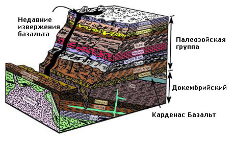 Рисунок 4. Геологическая “блоковая" схема расположения пластов горных пород Большого Каньона, на которой можно увидеть лавовые потоки Карденас Базальт в месте изображения последовательности залегания горных пород, обозначенной как Докембрийская и современные лавовые потоки, стекающие со стен Каньона с вершин вулканов, расположенных с северной стороны.