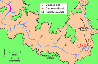 Рисунок 2: Карта Большого Каньона, на которой показано расположение выхода на поверхность лавовых пород слоя Карденас Базальт.