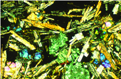 Рисунок 5. Изображение типичного образца слоя Карденас Базальт под геологическим микроскопом, где видны различные составные минералы, окрашенные в разные цвета.