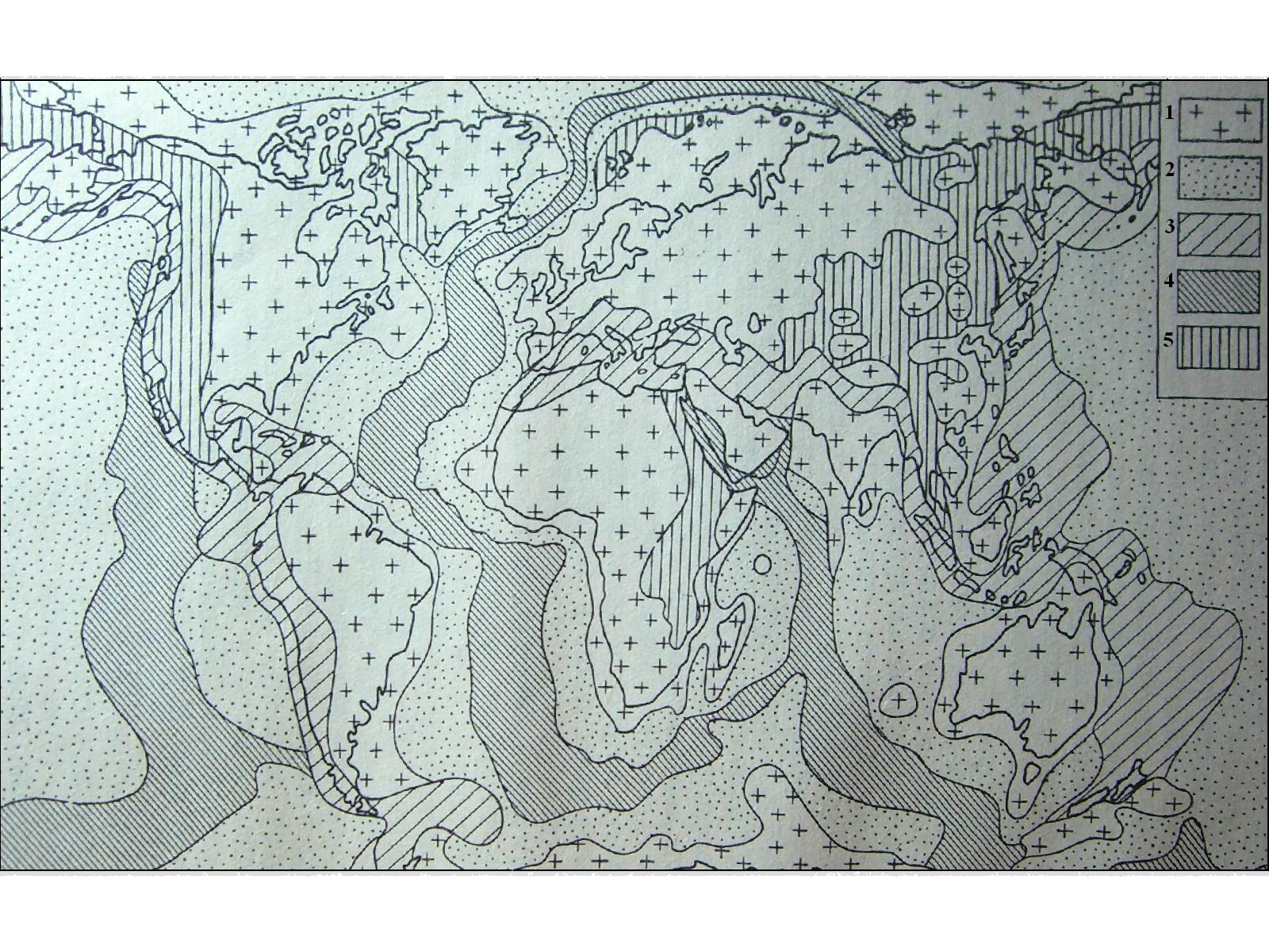 1 – материковые платформы, 2 – ложе океана, 3 –геосинклинальные пояса, 4 – срединно-океанические хребты, 5 – зоны распространения рифтогенеза на материковых платформах.