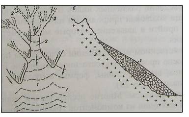 Рисунок 4 – Схема строения осыпи [6], где: а – в плане, б – в разрезе.