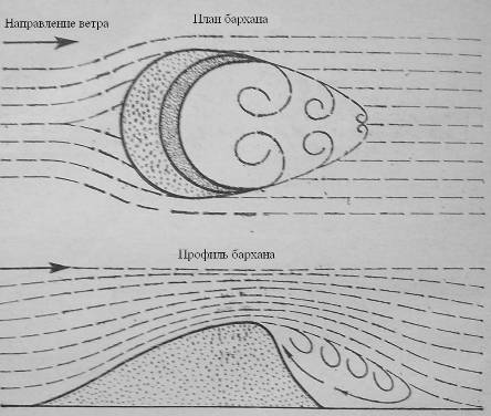 Барханы, барханные цепи, дюны – это седловидные (полумесяцеобразные) формы, они асимметричны, имеют пологие наветренные и крутые подветренные склоны, ориентированные поперек к господствующему направлению активных ветров (рисунок 3).