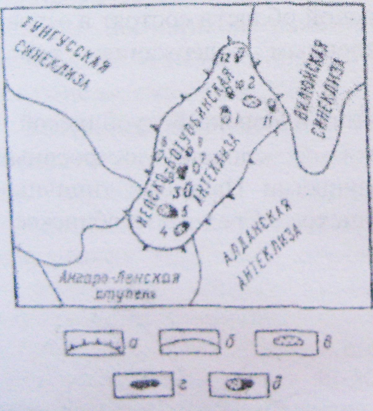 Месторождения: 1 –среднеботуобинское; 2 – Верхневилючанское; 3 – Ярактинекое; 4 – Марковское; 5 – Потаповское; 6 – Даннловское; 7 –Верхнечонское; 8 – Алнекое; 9 - Хотого-Мурбайское; 10 – Тасюрьяхское; 11 – Вилюйско-Джербинское; 12 – Иреляхское.