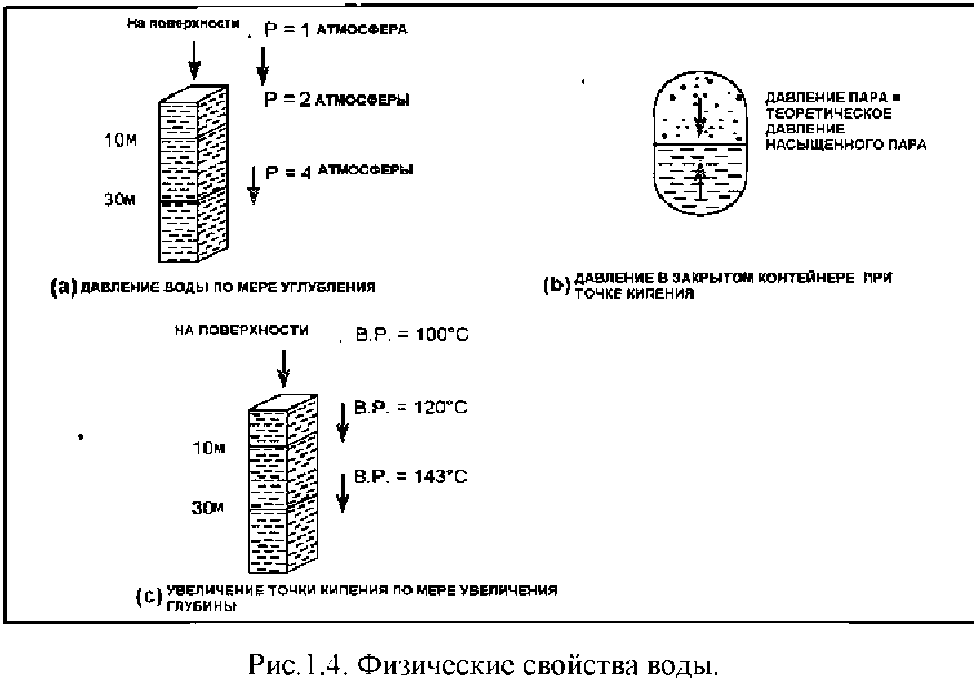 Следовательно, на глубине в столбе воды точка кипения выше, чем на дневной поверхности, где происходит кипение, когда давление водяного пара равно атмосферному давлению (100°С). Растворённые в воде газы существенно понижают точку кипения, тогда как иные растворённые вещества, такие как соли, поднимают точку кипения на небольшую величину (рис.1.5).