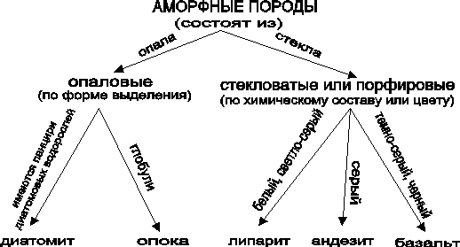 Аморфные породы состоят из аморфного вещества. Учитывая, что горные породы - это твердые вещества (ими сложена твердая, каменная оболочка земного шара – литосфера, как газами - атмосфера, водой - гидросфера), аморфные породы должны быть сложены твердыми аморфными веществами. К аморфным веществам относятся все газы, жидкости, а из твердых - стекла, смолы, гели и минерал опал. Из этого следует, что аморфные породы, как твердые вещества, могут слагаться стеклами и опалом.