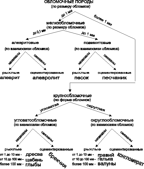 Так как обломочные породы сложены обломками, то эти породы можно разделять по размеру слагающих их обломков. Если размер обломков менее 1 мм, это мелкообломочная порода. Если он более 1 мм, то это крупнообломочная порода. Мелкообломочные породы в свою очередь еще раз разделяются по размеру обломков. Если он до 0,1 мм, то порода алевритовой структуры. Если более 0,1 мм, структура породы псаммитовая.