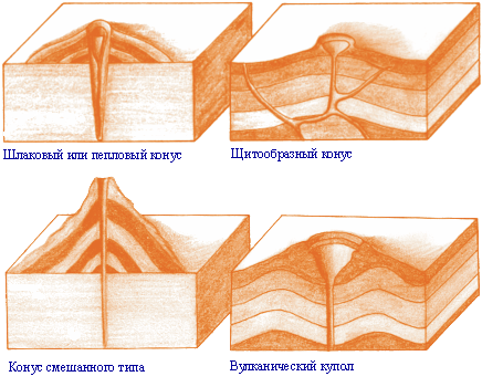 Шлаковый или пепловый конус, изображенный выше, образуется, когда при извержении вылетают в основном камни и пепел, но выделяется мало лавы. В Мексике очень известен вулкан Парикутин с характерным шлаковым конусом. В 1943 году этот вулкан появился на кукурузном поле. Через 6 дней он достиг высоты 150 метров! Затем он вырос до 400 метров в высоту и потух. При извержениях невзрывного типа с легко вытекающей лавой образуются щитовые конуса, показанные на схеме вверху. Вулканические острова Гавайи с их полого падающими склонами являются типичными щитовыми вулканами. Чередующиеся извержения с выбросом пыли, пепла и камней с последующим спокойным излиянием лавы создают конусы смешанного типа, как показано выше.