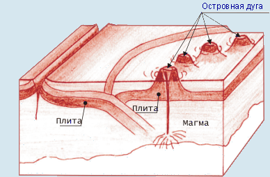 Много вулканов возникает в зоне границ надвига. На схеме внизу показано, как одна океаническая плита уходит под другую океаническую плиту. Опускающаяся кора расплавляется в астеносфере. Образующаяся при этом магма поднимается вверх. Эта магма образует вулканы на островах, называемых островными дугами. Примерами островных дуг являются Японские и Курильские острова.
