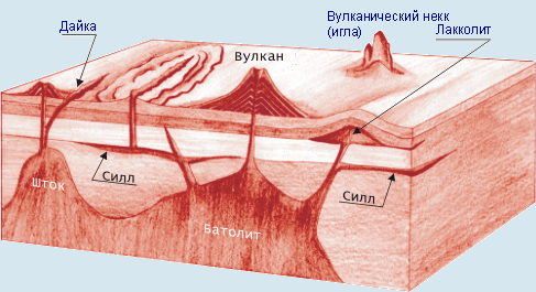 Породы, которые образуются в результате охлаждения и застывания магмы под землей, называются интрузивными породами. Вы не можете увидеть интрузивную породу, за исключением тех случаев, когда в результате каких-либо геологических процессов скрытая интрузивная порода окажется на поверхности. Например, вода может смыть верхнюю породу и открыть нижележащую. На схеме ниже показаны сразу пять интрузивных структур, поэтому Вы можете увидеть формы и относительные размеры каждой.