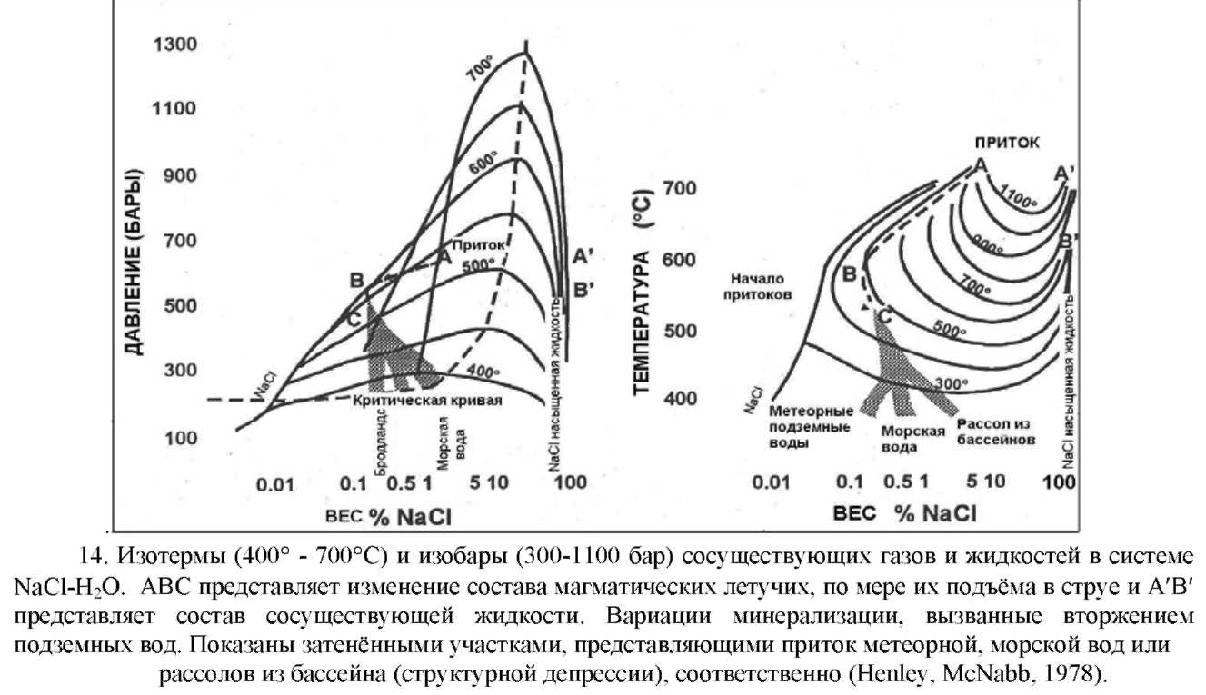 В порфировых около магматических средах вода может быть в условиях над критического режима, но отмечается, что критическая точка резко поднимается при повышении концентрации раствора (Рис.6). Таким образом, высокоминерализованные гидротермы, связанные с порфирами, могут находиться в до критическом режиме и подвергаться "кипению" с разделением на две разные фазы при температурах на многие сотни градусов, превышающие критическую температуру воды.